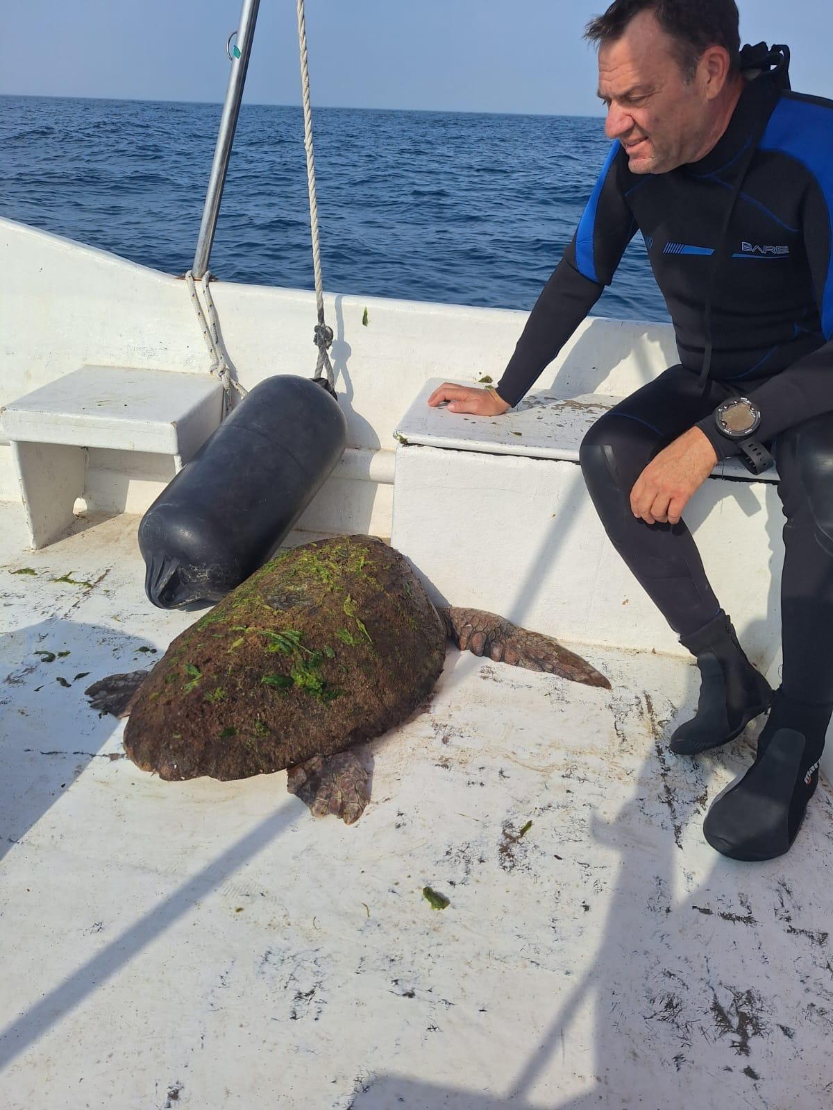 “خلال الإبحار استعدادًا لغوص روتيني، لاحظنا سلحفاة تبدو في ضائقة وغير قادرة على الغوص. وعند الاقتراب منها تبين أن أحد أطرافها مبتور. قفزنا إلى المياه، وانتشلناها إلى القارب وقدّمنا لها الإسعاف الأولي. السلحفاة معروفة لدى سلطة الطبيعة والحدائق، ونقلناها مباشرة إلى مركز إعادة التأهيل”.
